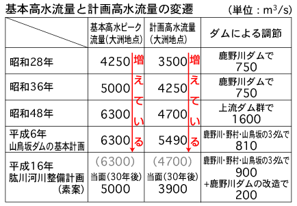 ちなみに、既設の鹿野川ダムは建設当時、「洪水時の大洲地点の水位を70cm下げる」とされていました(『肱川改修20年の歩み』編集発行建設省大洲工事事務所 昭和40年8月発行)。ところが、昨年11月に東大洲で開催された「平成7年度豪雨災害被害者の会」での国土交通省の説明では、「鹿野川ダム、野村ダム、山鳥坂ダムと鹿野川ダムの洪水調節量を増やしダムの改造をして、これら全部で大洲地点の水位を70cm下げる」とのことでした。どのダムもずいぶんと非力になったものです。 下の表は、肱川の基本高水流量(ダムによる調節前の流量)と計画高水流量(調節後の流量)を、発表された年代順に整理したものです。 |