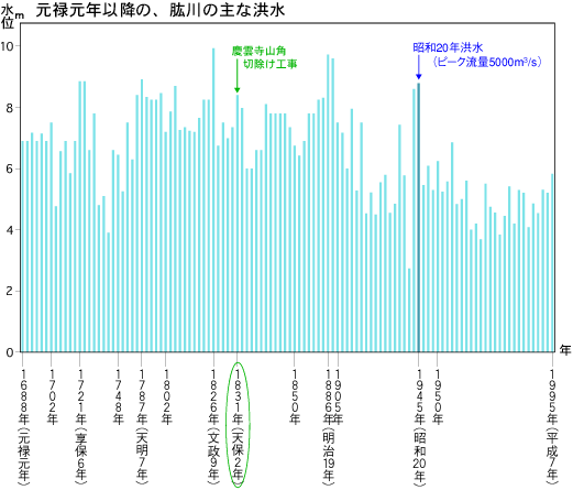下のグラフは、元禄元年以降の肱川の主な洪水をまとめたものです。流量( )ではなく水位(尺)での記録ですが、ピーク流量が毎秒5000トンであった昭和20年洪水をもとに比べてみますと、昭和20年洪水と同程度かそれを超えるような洪水が何度かあったことがわかります。