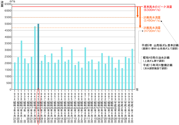 上は水位での比較でしたが、流量でも比較してみます。下のグラフは、1934年以降の洪水時の流量をまとめたものです。6300 という数字が、肱川の現状に対していかに大きいかわかります。そのような、いつ来るやらわからない大洪水に備えるといって上流にダムをいくつも建設するよりも、流域のどこに降った雨にも必ず対応できる堤防を整備する方がよほど現実的かつ効果的です。